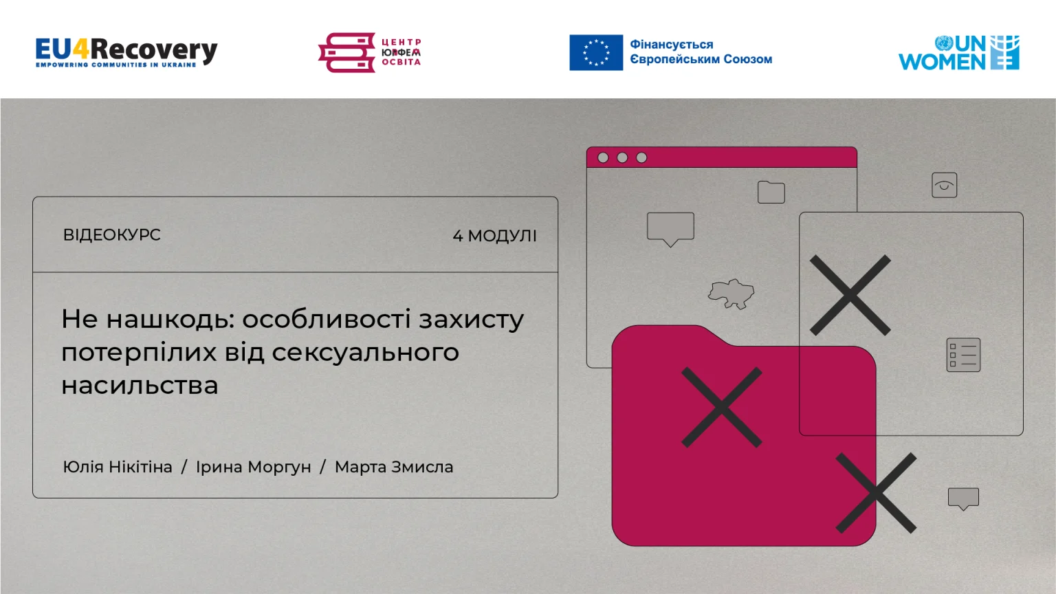 Курс створено громадською організацією “Асоціація жінок-юристок України “ЮрФем”” за підтримки Структури ООН із питань гендерної рівності та розширення прав і можливостей жінок (ООН Жінки) в межах проєкту “EU4Recovery – Розширення можливостей громад в Україні” (EU4Recovery) за фінансової підтримки Європейського Союзу.